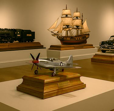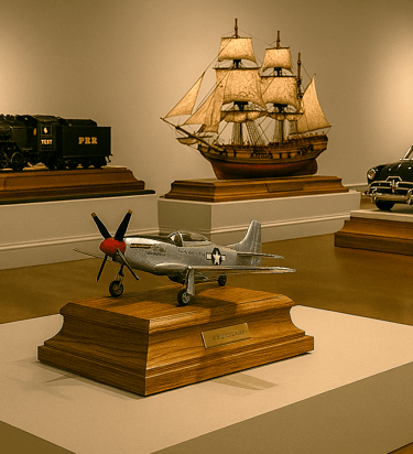 Bei Studio Works Design verwandeln unsere maßgefertigten Modellständer präzise gefertigte Modelle in faszinierende Blickfänge. Jeder handgefertigte Ständer ist mehr als nur ein Gestell – er ist eine Bühne, die die Geschichte Ihrer Modelle aufwertet, die Markenidentität stärkt und die Kunstfertigkeit jedes Zuges, Flugzeugs, Autos oder Schiffs würdigt. Ein ansprechend präsentiertes Modell beeindruckt nicht nur, sondern regt zum Gespräch an, hinterlässt Eindruck und bleibt in Erinnerung. Ob für Sammler, Ausstellungen oder Hersteller – unser Prozess verbindet handwerkliches Können mit partnerschaftlicher Zusammenarbeit, um Ihre Modelle elegant und wirkungsvoll in Szene zu setzen.